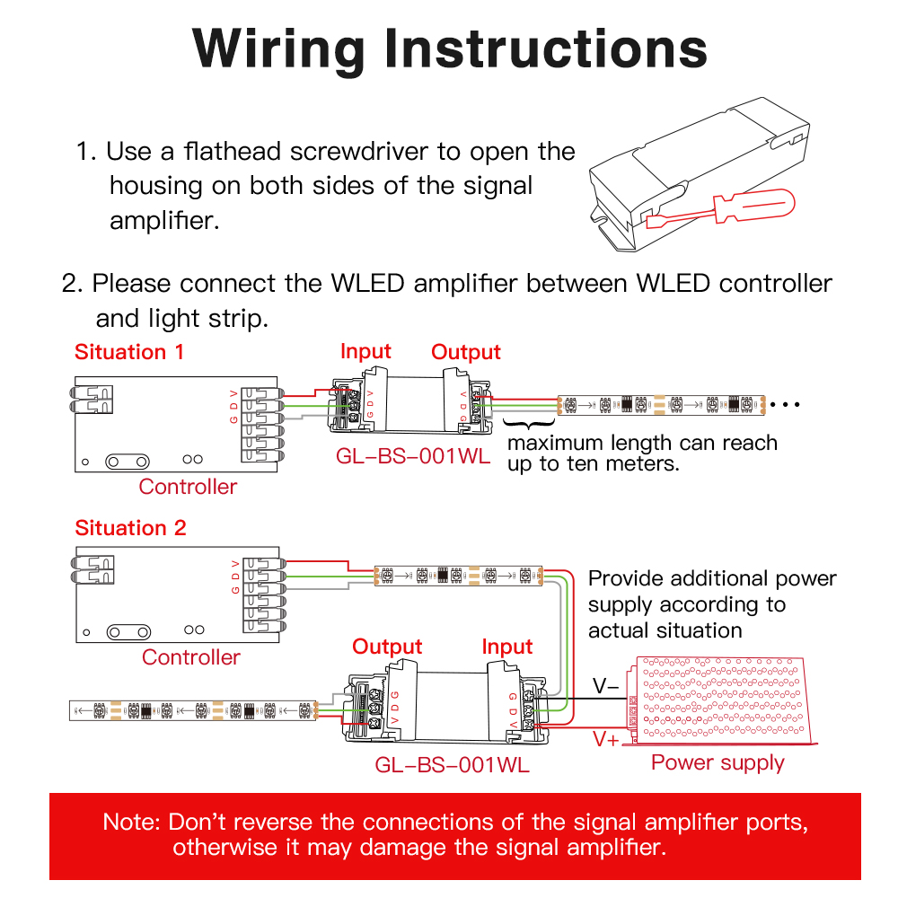 - Zosilňovač nemení napätie. Napájací zdroj je nutné zvoliť podľa napäťových a prúdových požiadaviek vášho LED pásika.
