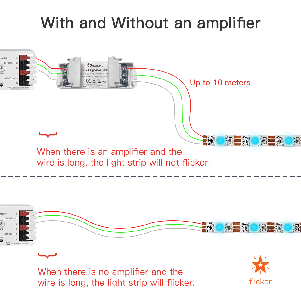 Ako Gledopto GL-BS-001WL funguje: Zosilňovač sa jednoducho zapojí medzi váš WLED ovládač a LED pásik. Jeho hlavnou úlohou je obnoviť integritu digitálneho signálu, ktorý sa môže znehodnotiť počas prenosu na dlhšie vzdialenosti. Tým zaistí, že LED pásik prijme čistý a presný signál, čo povedie k obnoveniu normálneho a stabilného zobrazenia svetelných efektov. Môže efektívne predĺžiť maximálnu dĺžku pásika až o desať metrov.