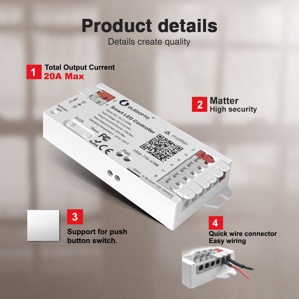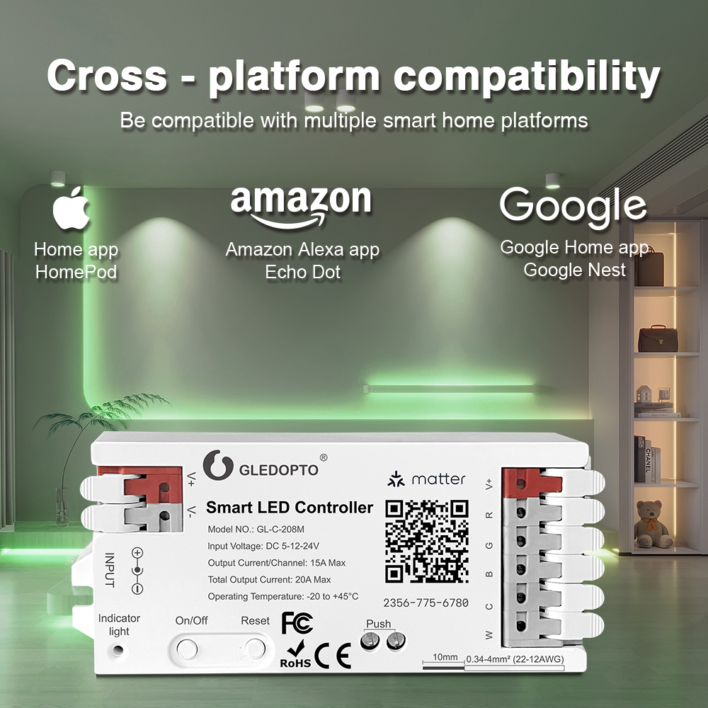 Gledopto GL-C-208M je ideálny pre vytvorenie dynamických a plne prispôsobiteľných svetelných scén vo vašej domácnosti alebo komerčných priestoroch. Objavte jednoduchosť a výkon protokolu Matter s týmto pokročilým RGBCCT LED ovládačom.