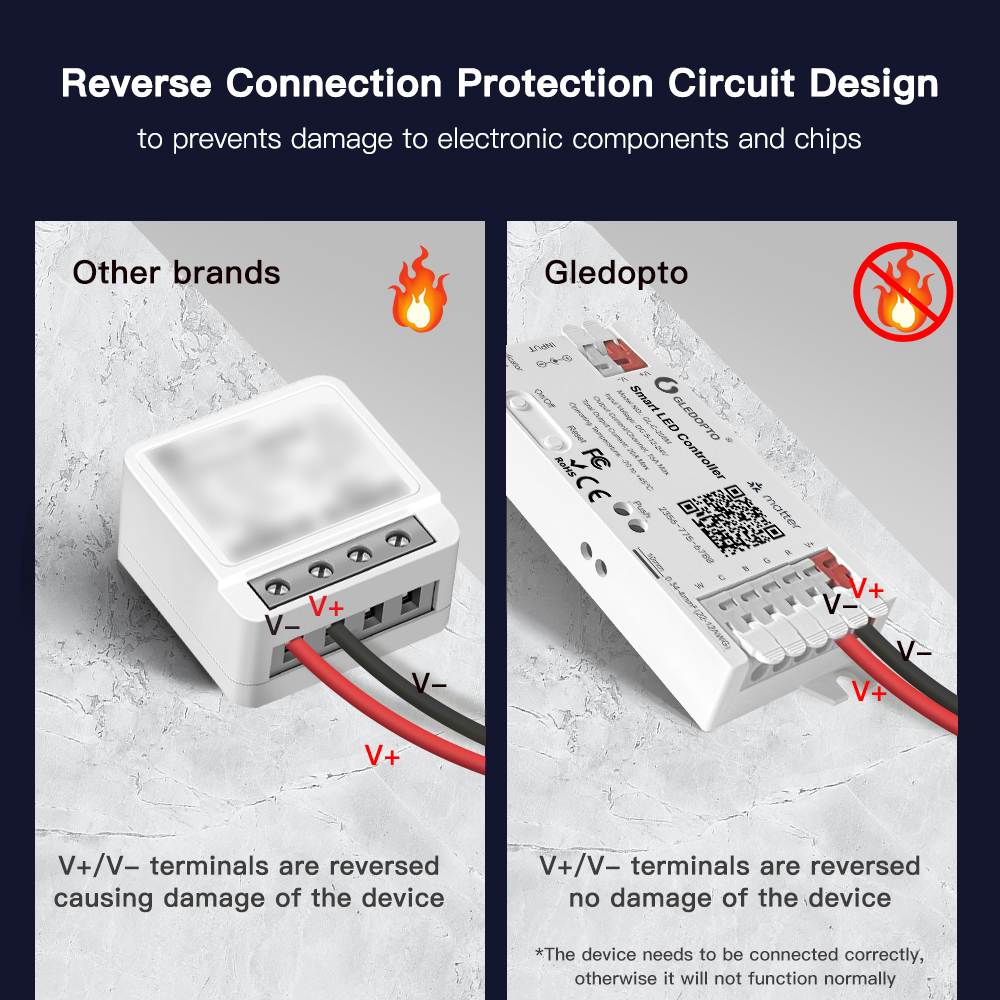 - Ochrana proti prepólovaniu: Integrovaná ochrana chráni ovládač aj LED pásiky pred poškodením pri zlom zapojení.
