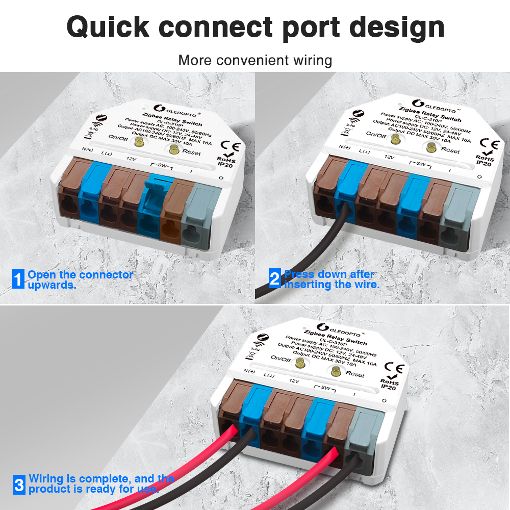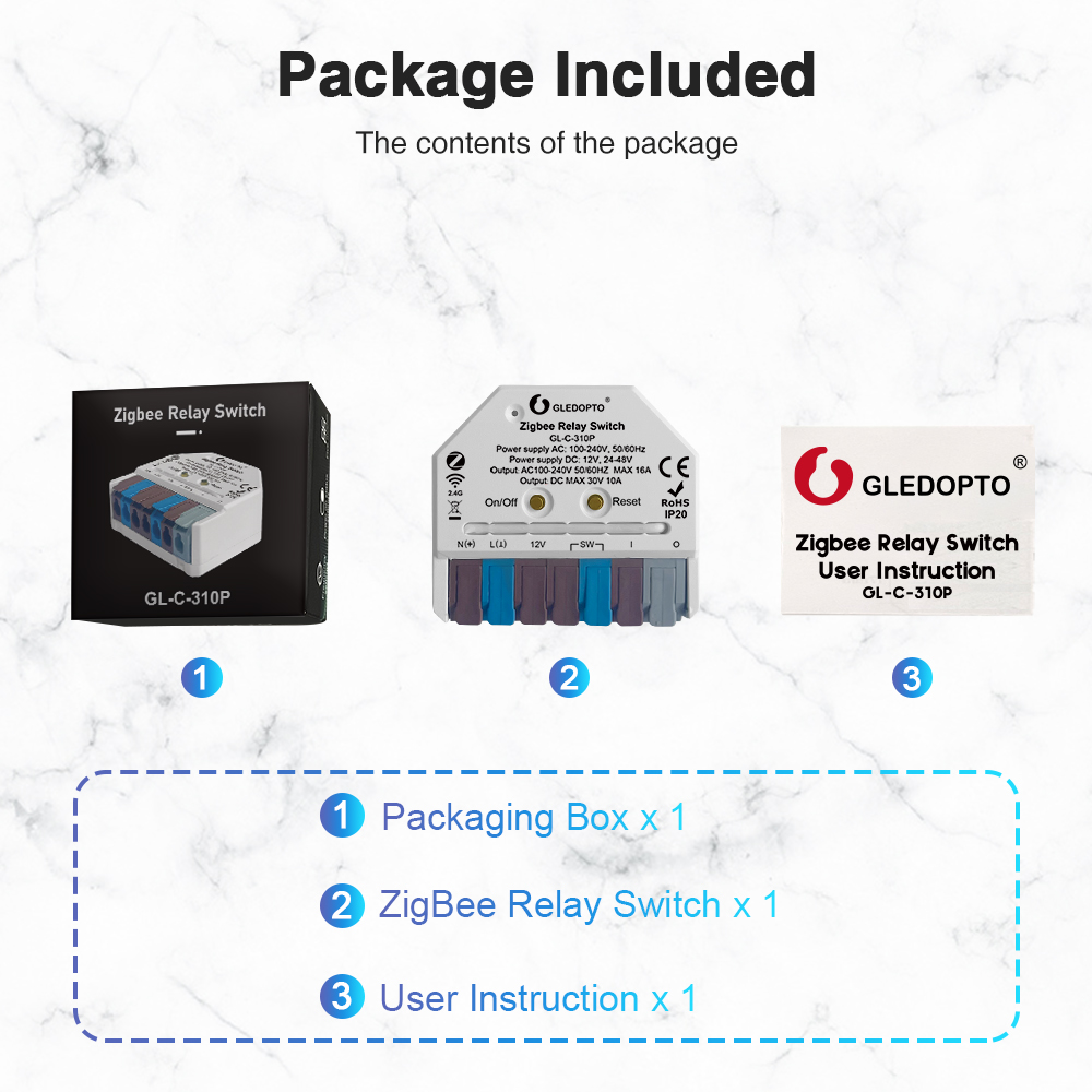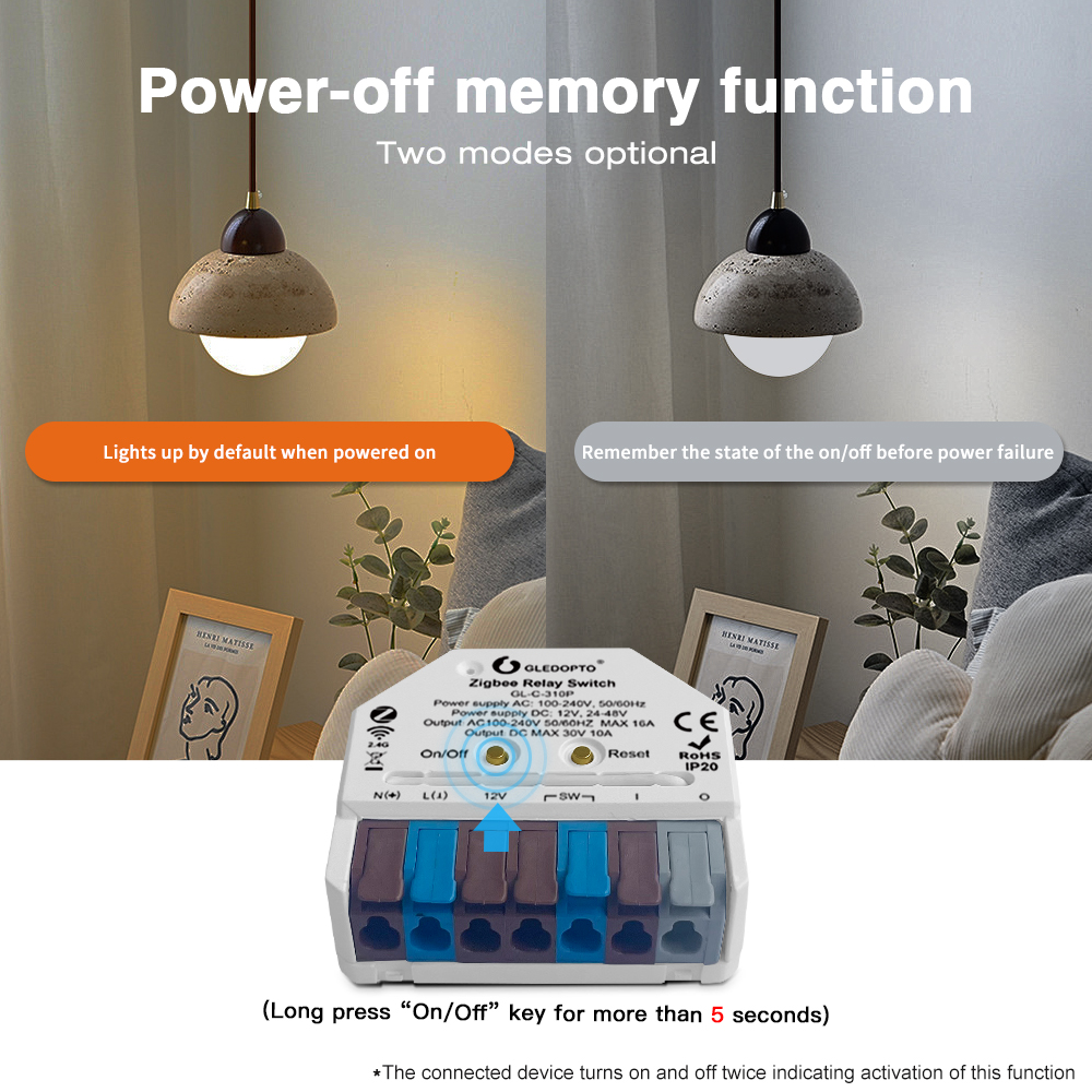 Gledopto GL-C-310P je kompaktný a všestranný ZigBee relé spínač, ktorý prináša inteligentnú funkcionalitu do vašej existujúcej elektrickej inštalácie. S jeho malými rozmermi (42x38x17mm) ho možno ľahko umiestniť za vypínač do krabice, do svietidla alebo inam, kde je potrebná diskrétna, no efektívna inteligentná kontrola.