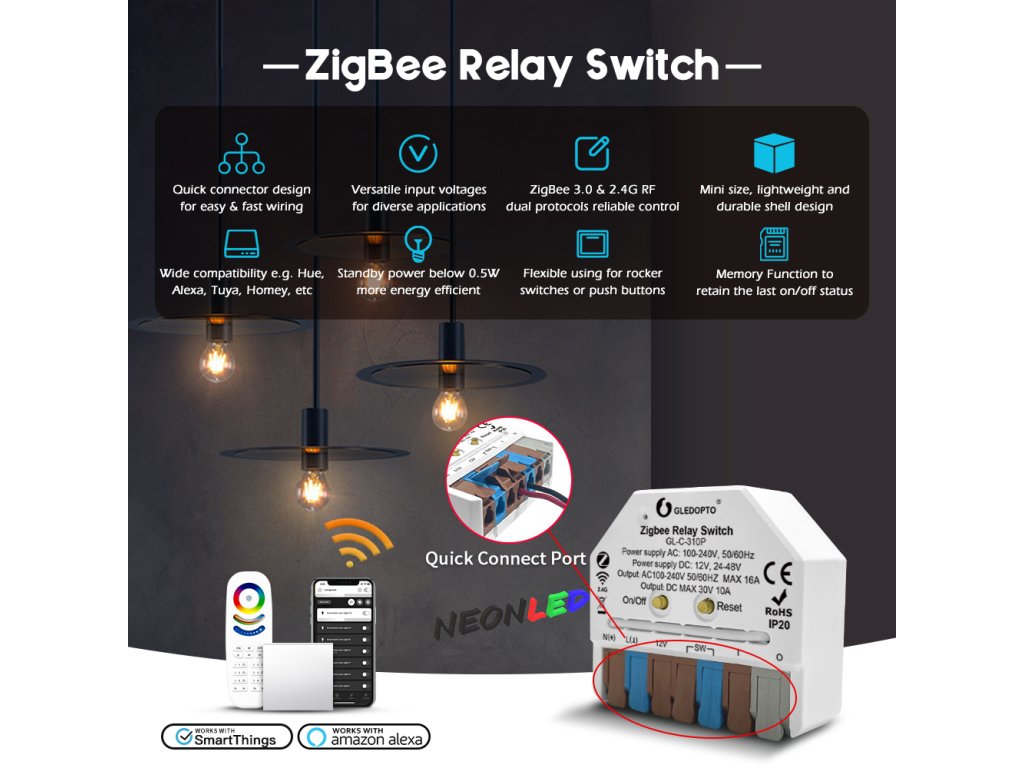 - ZigBee 3.0 a 2.4G RF: Plná kompatibilita s protokolom ZigBee 3.0 umožňuje jednoduché pripojenie k bránam ako Philips Hue, Amazon Echo Plus, SmartThings a mnohým ďalším. Navyše podpora 2.4G RF diaľkových ovládačov Gledopto poskytuje lokálne bezdrôtové ovládanie.