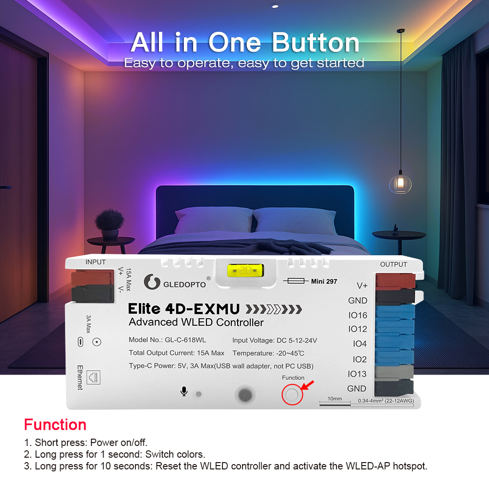 - Flexibilné napájanie: Široký rozsah vstupného napätia DC 5-12-24V s celkovým výstupným prúdom až 15A Max pre napájanie rozsiahlych LED inštalácií. Port Type-C slúži na napájanie (5V/3A Max) alebo na jednoduchú aktualizáciu firmvéru.