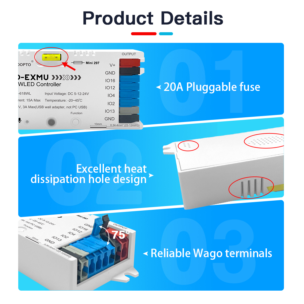 - Bezpečnosť a spoľahlivosť: Vyrobené z ohňovzdorného PC materiálu s krytím IP20. Ovládač je továrensky vybavený 20A poistkou, súčasťou balenia je aj náhradná 5A poistka pre flexibilný výber podľa potrieb inštalácie.
