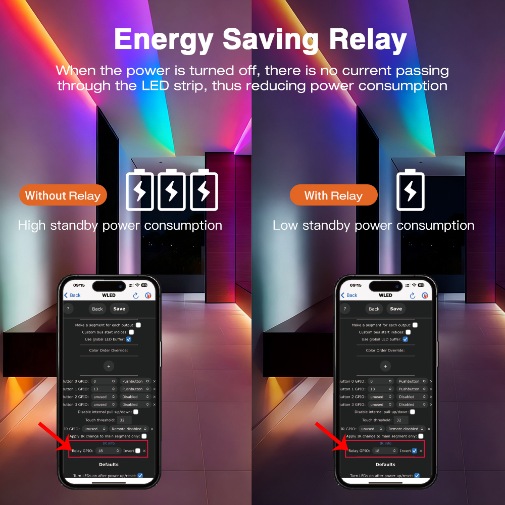 - Integrované relé: Funkcia relé (GPIO18) s možnosťou inverzie umožňuje kompletne odpojiť napájanie z výstupného terminálu, keď sú svetlá vypnuté. Tým sa šetrí energia a eliminuje sa prípadné minimálne žiarenie LED pásika.