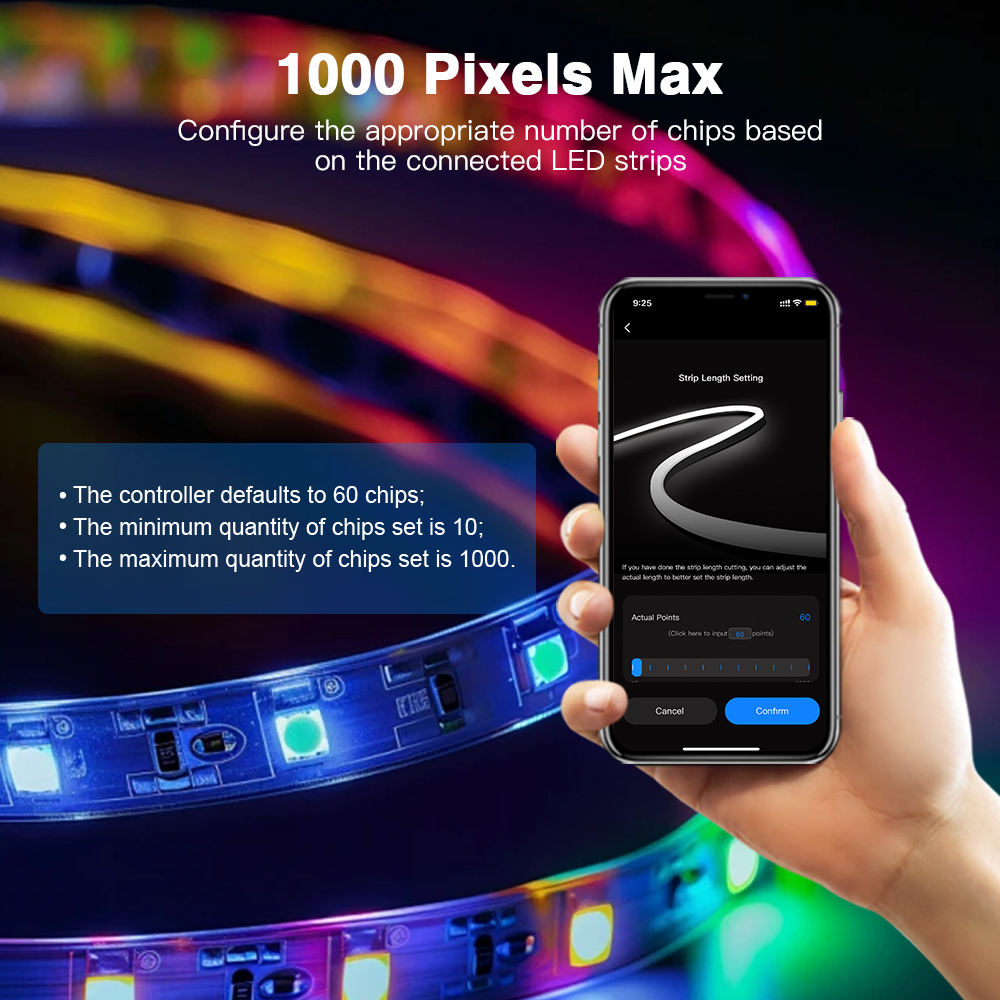 - Až 1000 pixelov: Ovládajte rozsiahle svetelné inštalácie s podporou až 1000 adresovateľných pixelov. Môžete nastaviť počet čipov od 10 do 1000 (predvolených 60).