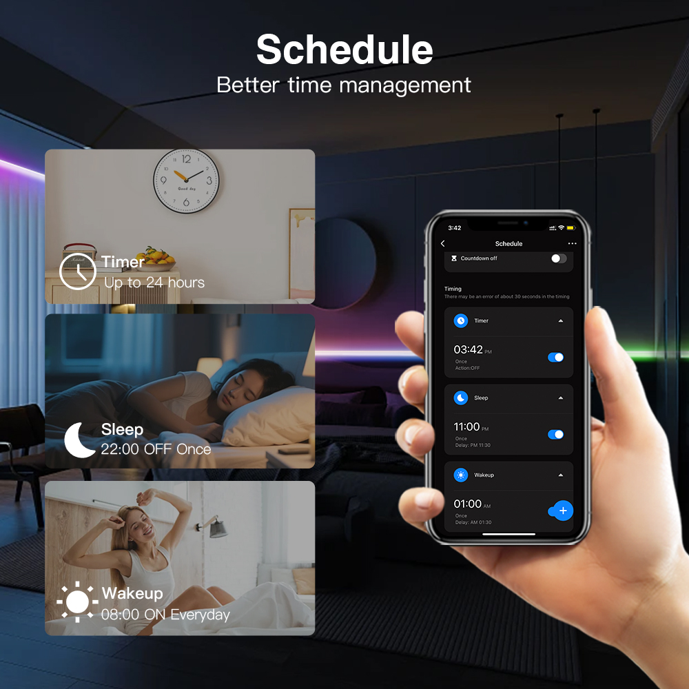 - Pokročilé plánovanie a režimy: Nastavte časové plány, odpočítavanie pre vypnutie, funkcie prebudenia/spánku a režim Nerušiť pre optimalizáciu spotreby energie.
