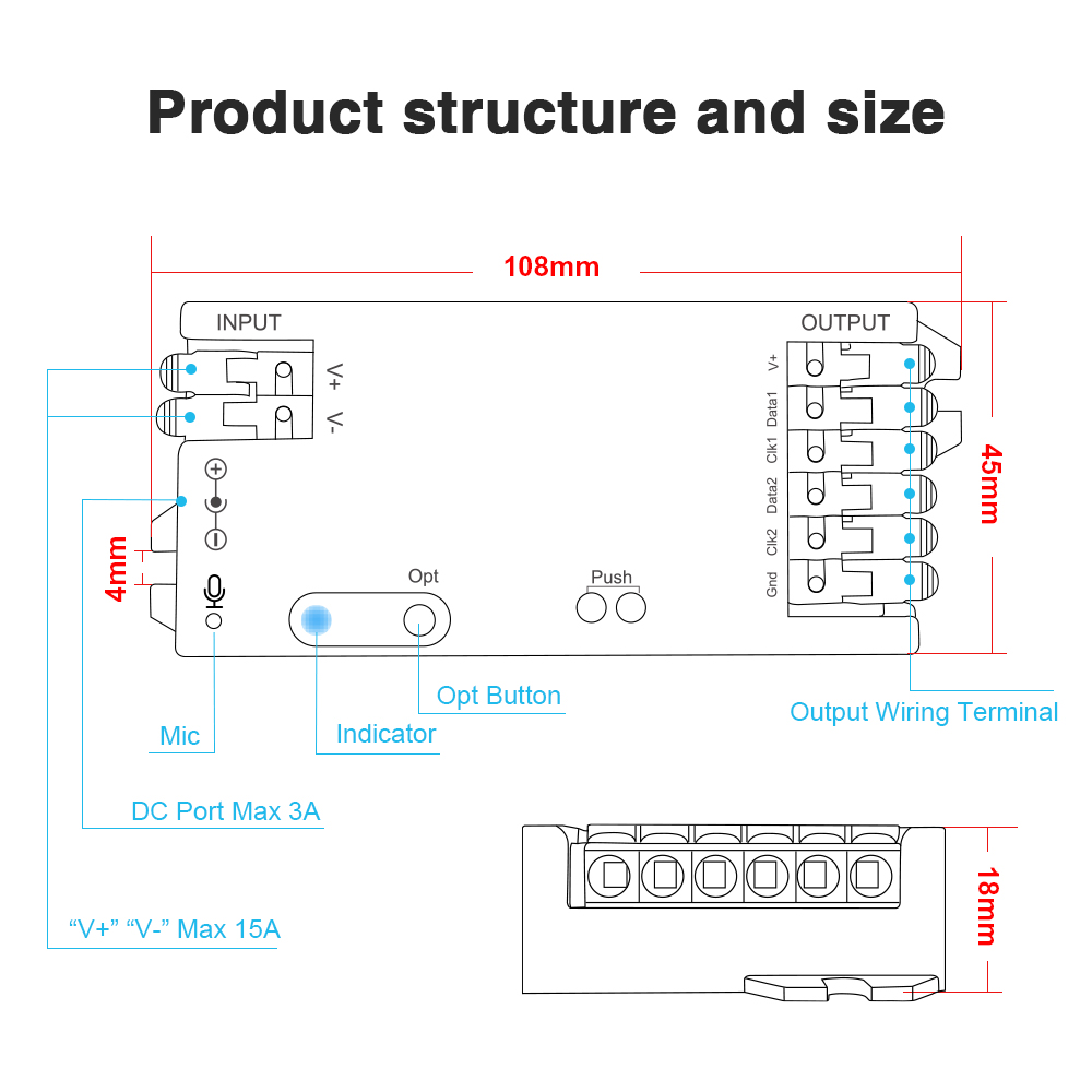- Pohodlné tlačidlové ovládanie: Fyzické tlačidlo pre rýchle zapnutie/vypnutie, prepínanie 24 dynamických efektov a prepínanie pamäte po zapnutí (predvolená je vypnutá pamäť). Dlhým stlačením tlačidla je možné ovládač resetovať do továrenských nastavení.