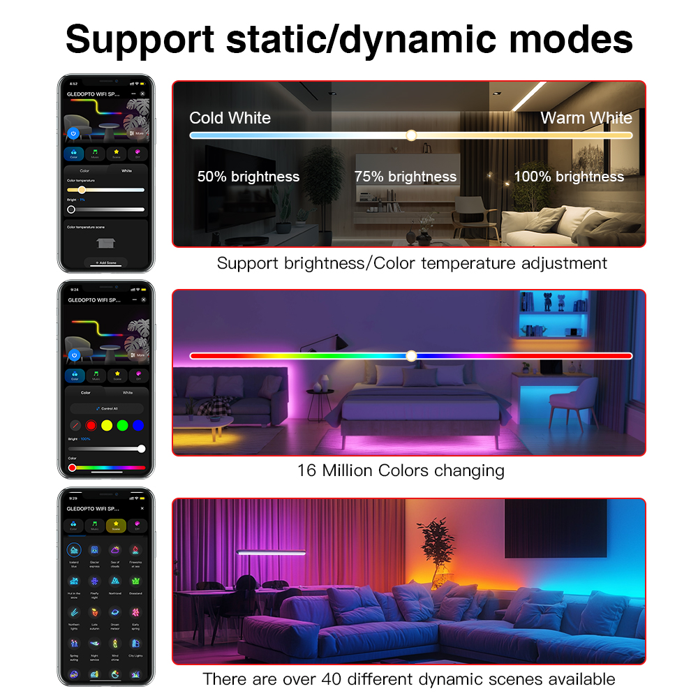 - 20 segmentov pre kontrolu: Rozdeľte LED pásik na 20 individuálnych segmentov pre nezávislé stmievanie, úpravy farieb a aplikáciu efektov.