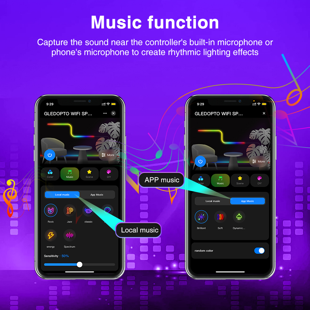 - Synchronizácia s hudbou: Využite vstavaný mikrofón ovládača (6 rytmických režimov) alebo mikrofón telefónu (3 rytmické režimy) pre pôsobivé svetelné efekty synchronizované s hudbou a okolitými zvukmi.