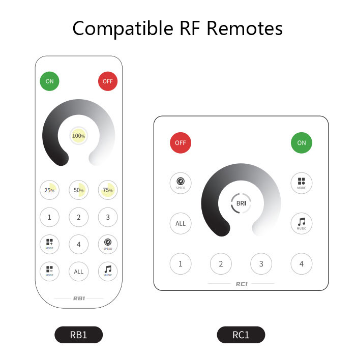 - Spôsoby ovládania: Smartfón aplikácia (Bluetooth), RF dotykový panel (RC1), Hudobný senzor (vstavaný mikrofón)