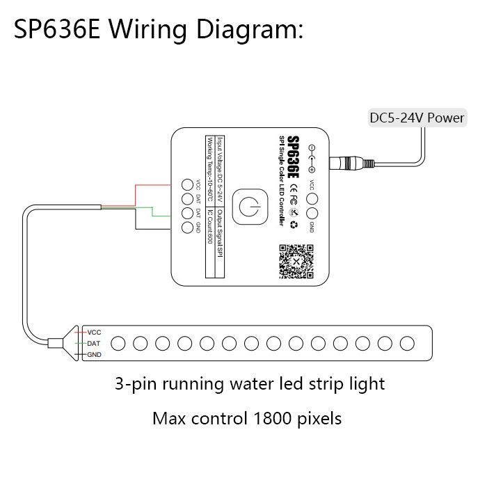 SP636E kontrolér pre Running water LED SPI pásy, Bluetooth, diaľkový ovládač, 1800 pixelov, 5-24VDC