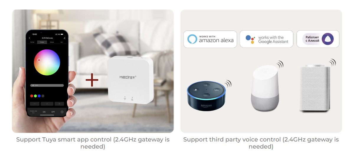 - Široké možnosti ovládania: Svetlo je možné ovládať pomocou RF diaľkových ovládačov (2.4GHz), panelových ovládačov alebo cez smartfón a hlasových asistentov (Alexa, Google Assistant) pri použití príslušnej brány (napr. brána WL-Box1).