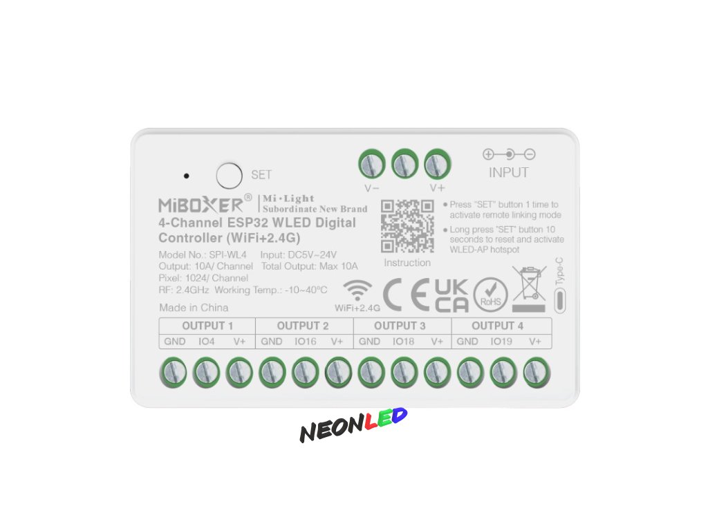 MiBoxer SPI-WL4: 4-kanálový WLED ovládač s ESP32 a WiFi/2.4G – Až 4 x 1000+ pixelov na kanál