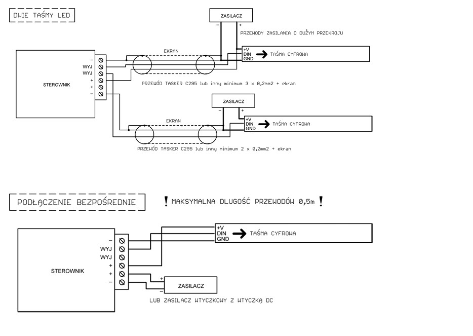- Odporúčaná dĺžka riadiaceho kábla LED pásika: Max. 10 cm (dlhší vyžaduje tienený kábel).