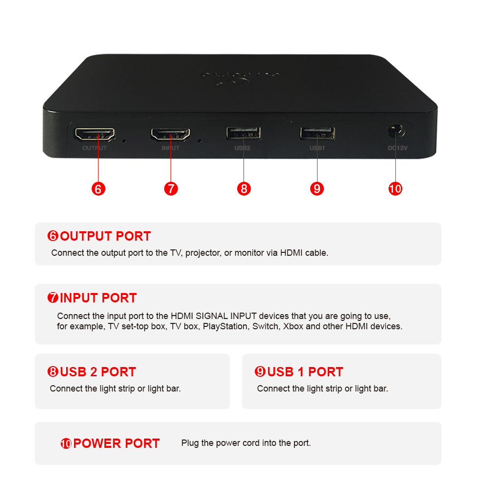 - Pripojíte vašu hernú konzolu (PlayStation 5, Xbox Series X), Apple TV, Nvidia Shield alebo iný prehrávač do HDMI vstupu Sync Boxu.