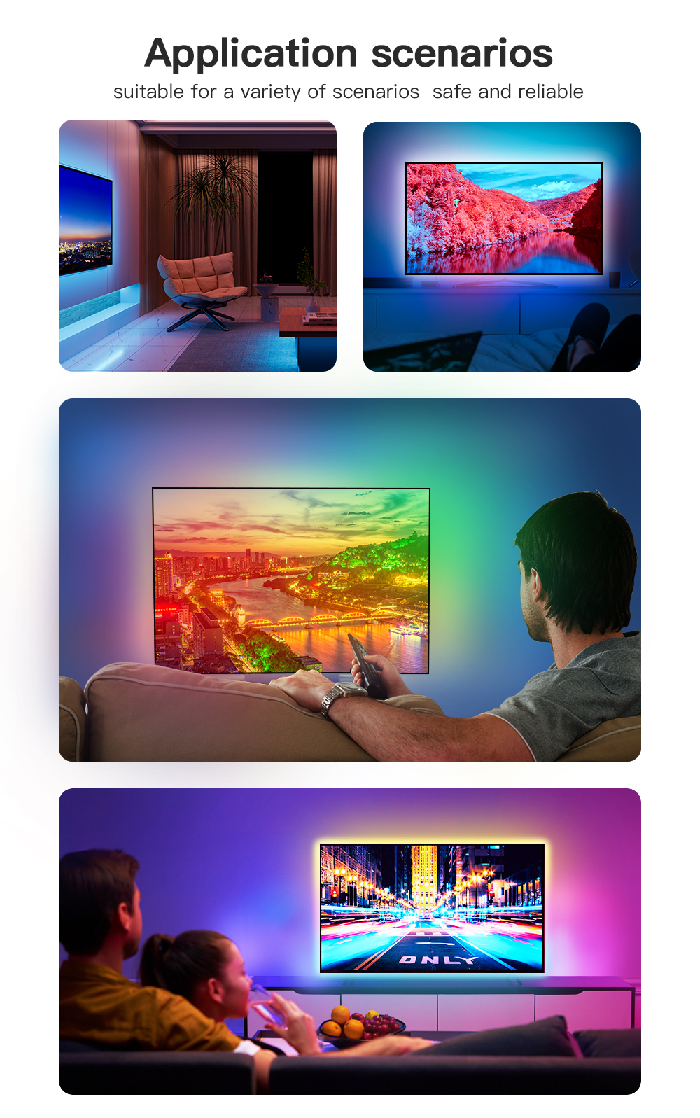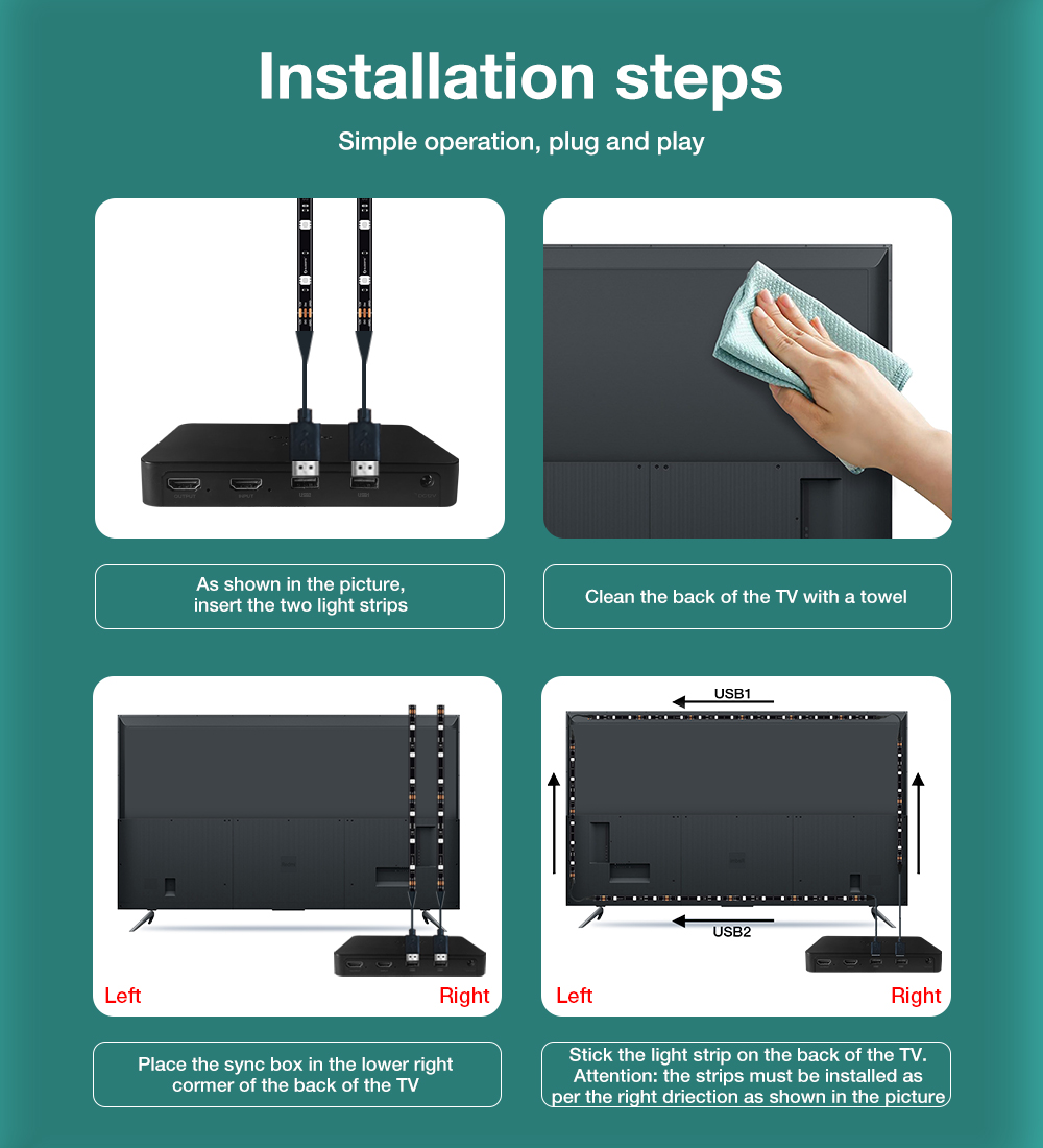 - Nalepíte priložený LED pásik na zadnú stranu TV a pripojíte ho k Boxu.