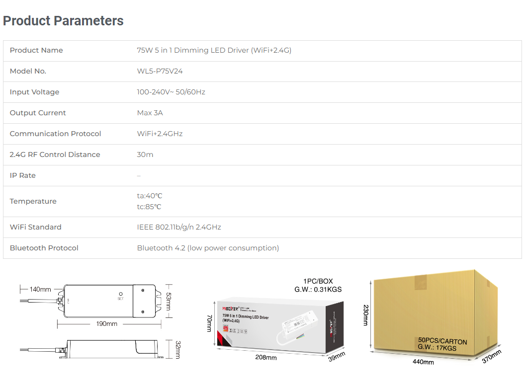 WL5-P75V24 ( 5 v 1 ) LED ovládač s integrovaným napájacím zdrojom 75W / 24VDC, Mono, CCT, RGB, RGBW, RGB+CCT, WiFi + RF 2,4Ghz