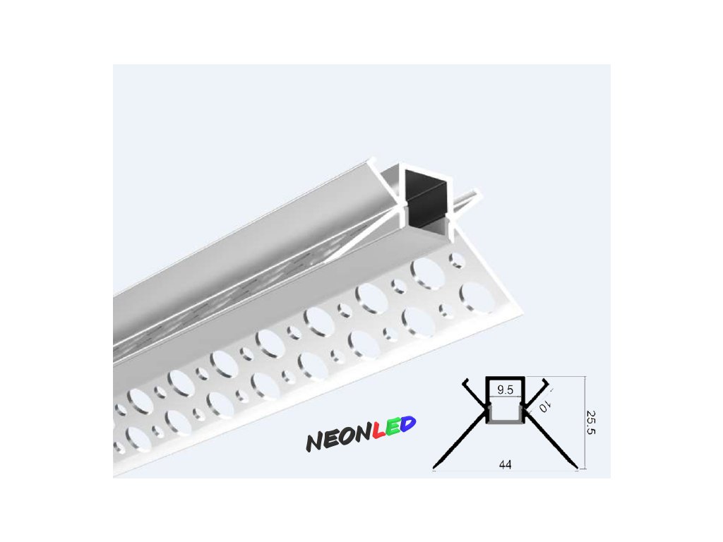 Profil je vyrobený z vysoko kvalitného hliníka, navrhnutý pre pružné alebo tuhé LED pásy, ktoré sú široké 9,5 mm, LED diódy je možné schovať za kryt z polykarbonátu. Kryt je certifikovaný pre vynikajúcu odolnosť voči všetkým poveternostným podmienkam, UV žiareniu a spomaľuje horenie. Koncové kryty chránia profil pred prachom a inými nežiadúcimi prvkami, ktoré môžu LED pásy zašpiniť a následne zhoršiť svetelné parametre. Profil sa inštaluje do sadrokartónu pomocou vhodného montážneho lepidla alebo montážnych skrutiek. Mali by ste naniesť vrstvu lepidla na prírubu profilu a naniesť sieťku na sadrokartón, utesnite ju výplňou a keď je suchá, prebrúste ju